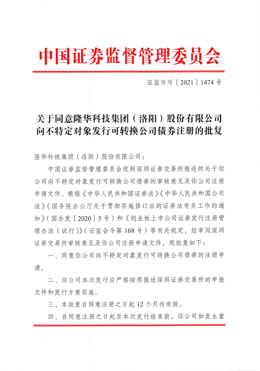 近日,隆華科技收到中國證券監(jiān)督管理委員會(huì)出具的《關(guān)于同意隆華科技集團(tuán)(洛陽)股份有限公司向不特定對(duì)象發(fā)行可轉(zhuǎn)換公司債券注冊(cè)的批復(fù)》(證監(jiān)許可〔2021〕1474號(hào))。